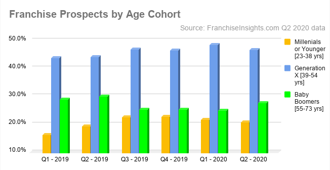 While Gen X has represented close to half of total prospective franchise buyers over the past several years, recent data reveals that Baby Boomers (ages 55-73) represent the fastest growing age cohort of franchise prospects in 2020. Boomers' share of prospects jumped 11% Q2 v Q1, now representing 27%+ for the biggest share since 2Q19.