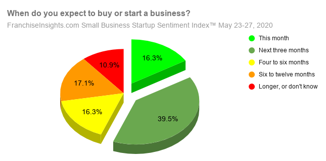 The latest response to an ongoing survey of thousands of prospective franchise buyers indicates that more are ready to buy "this month" or with the "next 3 months" than at any time YTD 2020. Perhaps not surprising given recent upticks in consumer confidence and with all the pent-up demand around re-opening the economy, 56% of respondents said they expect to start their business within 3 months. And, 16% expect to start this month.